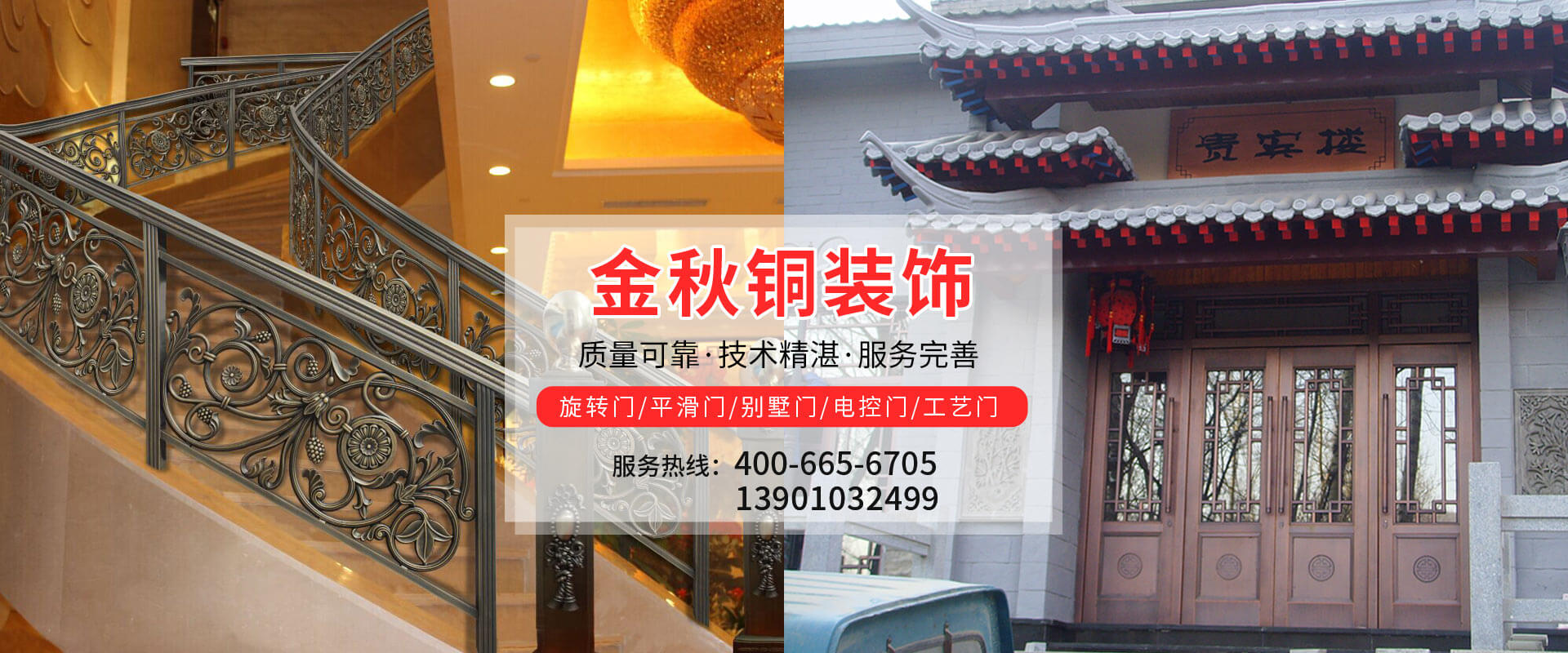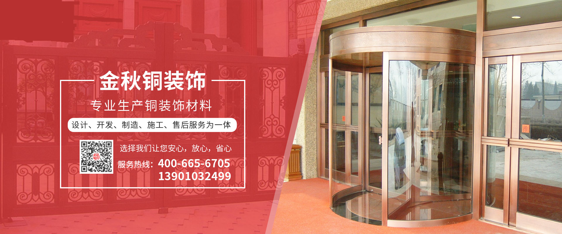 北京金秋銅裝飾材料有限公司是專業(yè)生產(chǎn)銅裝飾材料及設(shè)計、開發(fā)、制造、施工、售后服務(wù)為一體的大型綜合企業(yè)。可承接建筑銅裝飾工程及五星級酒店、別墅、博物館、樓樘管所等高檔銅裝飾項(xiàng)目;生產(chǎn)各種規(guī)格的旋轉(zhuǎn)門、平滑門、別墅門、電控門、工藝門、旋轉(zhuǎn)護(hù)欄、屋頂銅飾防水瓦、浮雕壁畫......